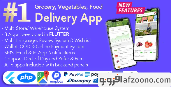 برنامه اندروید تحویل مواد غذایی و سبزیجات با پنل مدیریت | چند فروشگاهی با 6 برنامه این برنامه اندروید فرایند سفارش، خرید و تحویل مواد غذایی را برای مشتری تسهیل می کند. شما میتوانید کسب کار خود را به وسیله آن راه بیاندازید و یا آن را گسترش دهید و به راحتی مدیریت کنید.