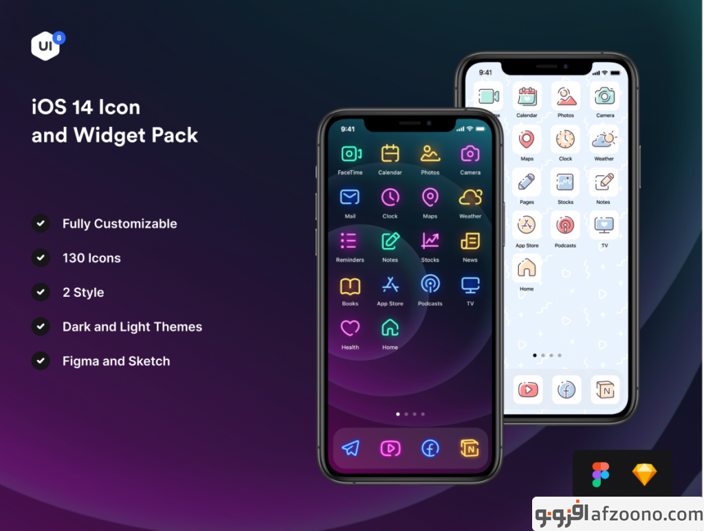 iOS 14 App Icon and Widget Pack include 2 different styles – Neon and Cartoon. All 100% vector and all colors editable in just a few clicks with the perfect organization in both Figma and Sketch. Click Here to see a tutorial on how to implement custom app icons on iOS 14